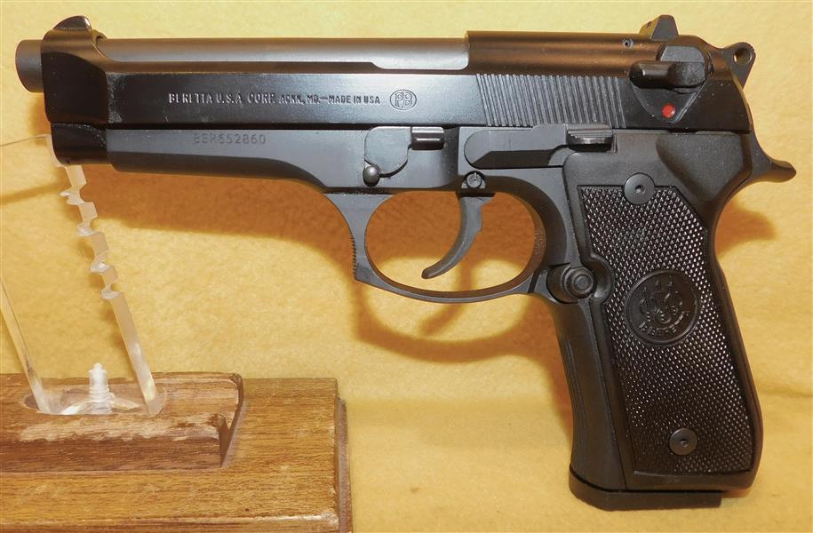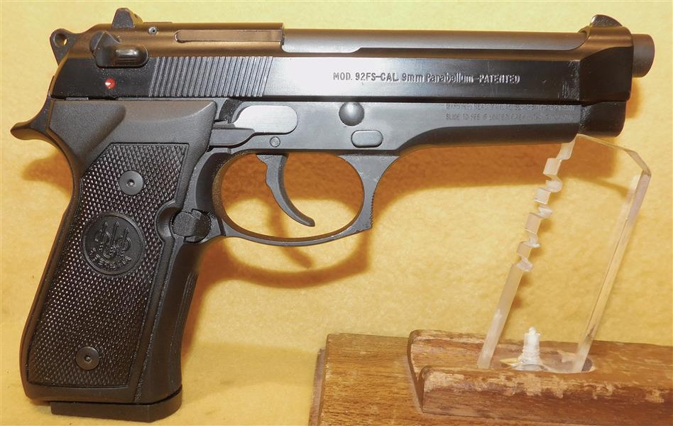 BERETTA 92FS IN 9MM CAL., WITH 5" BARREL. COLOR BLACK. CONDITION 96%+. SERIAL NUMBER BER652860. BERETTA MODEL 92FS IN .9MM CALIBER, MIRROR BORE, GRIPS EXCELLENT, COMES WITH ONE FACTORY MAGAZINE, 96%+ OVERALL CONDITION, OUR STOCK # D8084. OUR OLD STOCK # YA16100