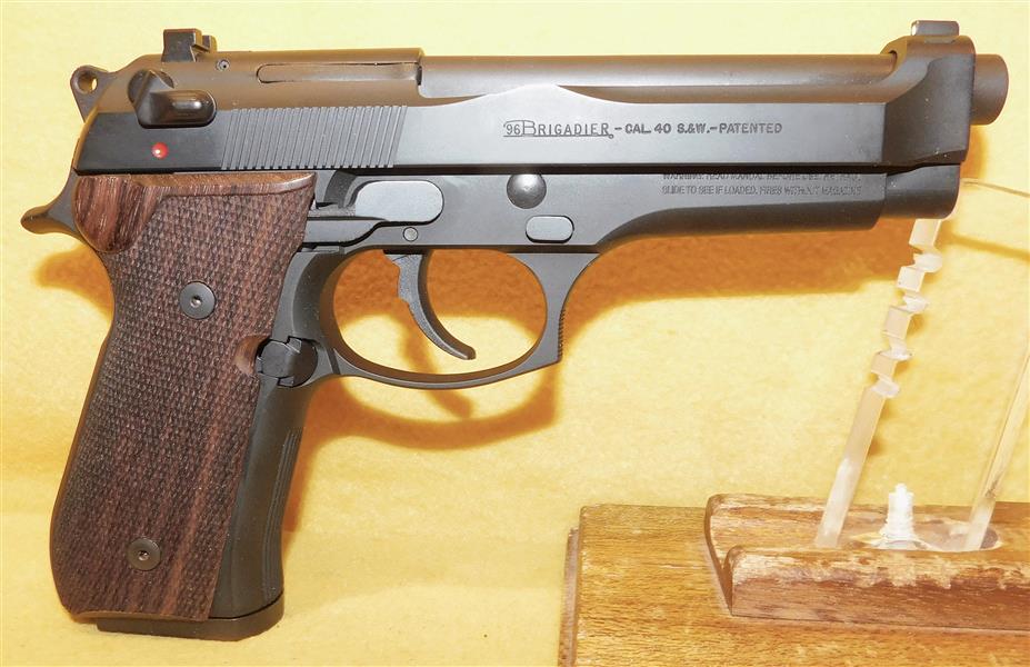 BERETTA 96 BRIGADIER IN .40 CAL., WITH 4.5" BARREL. COLOR MATTE. CONDITION 98% (UNFIRED). SERIAL NUMBER BER338193. BERETTA MODEL 96 BRIGADIER IN .40 CALIBER, MIRROR BORE, CHECKERED WALNUT GRIPS EXCELLENT, COMES WITH ONE FACTORY MAGAZINE, HARD CASE, 98% (UNFIRED) OVERALL CONDITION, OUR STOCK # D8244. OUR OLD STOCK # YA16163