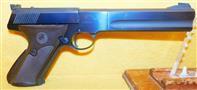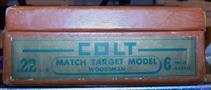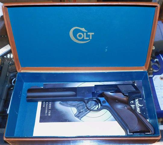 COLT MATCH TARGET IN .22 L.R. CAL., WITH 6" BARREL. COLOR BLUE. CONDITION 96%. SERIAL NUMBER 139492-S. COLT MODEL MATCH TARGET (CIRCA 1954) IN .22 L.R. CALIBER. MIRROR BORE, GRIPS EXCELLENT, COMES WITH TWO FACTORY MAGAZINES, ORIGINAL GOLD LABEL BOX WITH TEST TARGET AND PARTS LIST, 96% OVERALL CONDITION, OUR STOCK # D5981. OUR OLD STOCK # YA15276