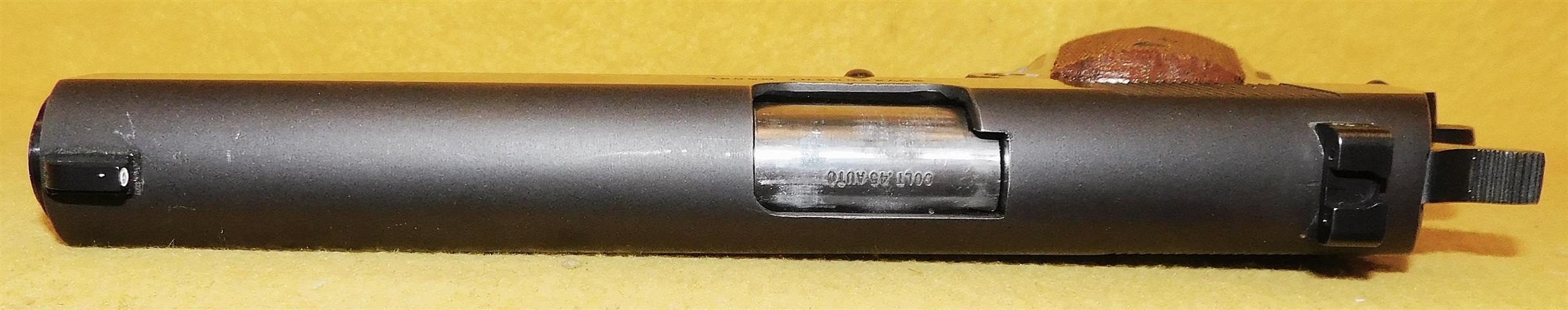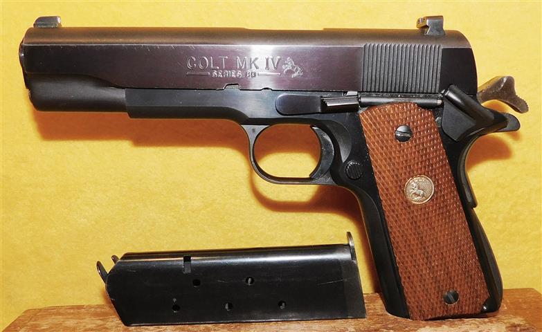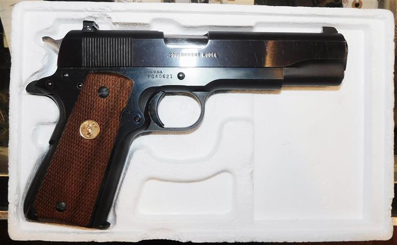 COLT GOV MK VI IN .45 ACP CAL, WITH 5" BARREL. COLOR BLUE. CONDITION 97%. SERIAL NUMBER FG40601. COLT MODEL GOVERNMENT MK VI (CIRCA 1984) IN .45 ACP CALIBER, MIRROR BORE, WALNUT CHECKERED GRIP PANNELS EXCELLENT, COMES WITH ONE MAGAZINE, TATTERED ORIGINAL BOX, 97% OVERALL CONDITION OUR STOCK # D6987. OUR OLD STOCK # YA15628