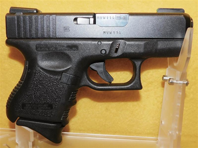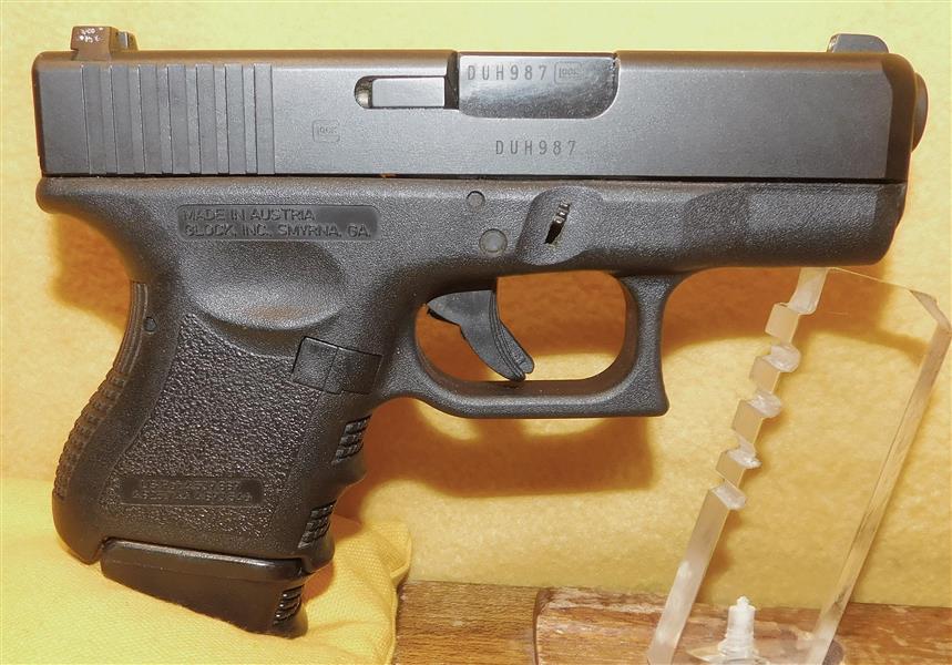 GLOCK G27 (NOT FOR SALE IN MASS.) IN .9MM CAL., WITH 3 .25" BARREL. COLOR BLACK. CONDITION 98%. SERIAL NUMBER BELN405. GLOCK MODEL G27 IN .9MM CALIBER, MIRROR BORE, GRIPS WITH EXTRA BACK STRAPS EXCELLENT, COMES WITH HARD CASE, PAPERS, TWO FACTORY MAGAZINES, 98% OVERALL CONDITION, OUR STOCK # D7664. OUR OLD STOCK # YA15979