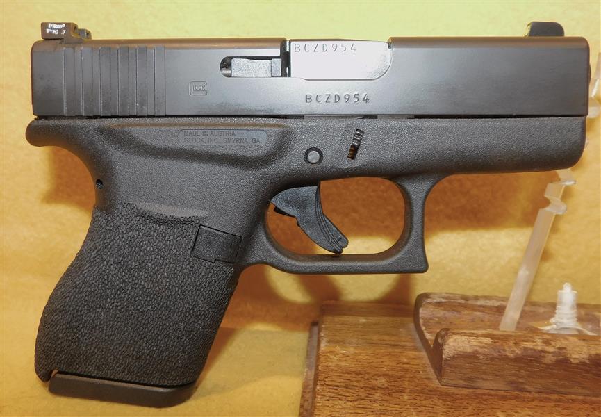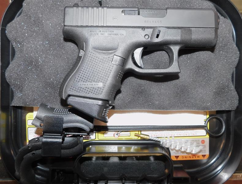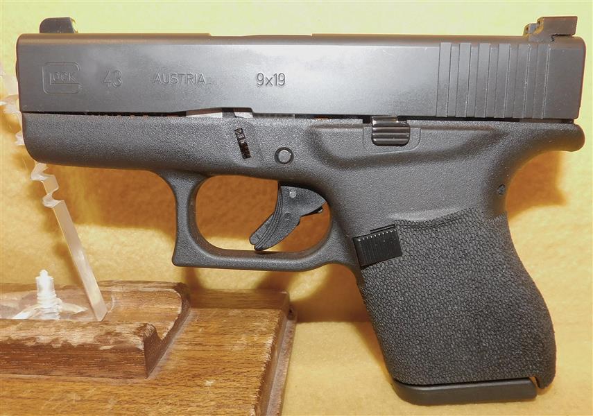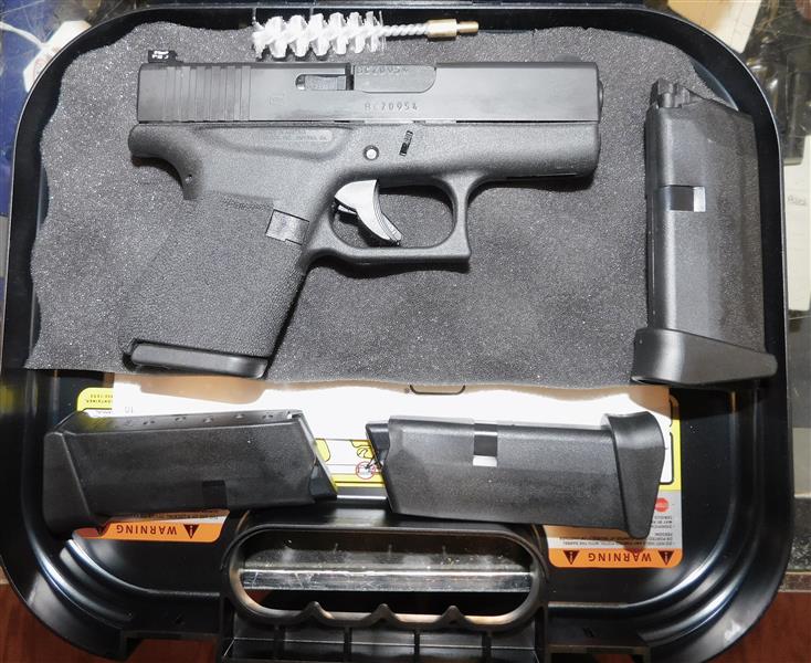 GLOCK G43 (NOT FOR SALE IN MASS.) IN .9MM CAL., WITH 3 .25" BARREL. COLOR BLACK. CONDITION 98%. SERIAL NUMBER BCZD954. GLOCK MODEL G43 IN .9MM CALIBER, MIRROR BORE, GRIPS EXCELLENT, COMES WITH THREE FACTORY MAGAZINES, HARD CASE WITH PAPERS, 98% OVERALL CONDITION, OUR STOCK # D7551 . OUR OLD STOCK # YA15981
