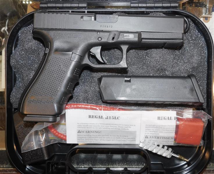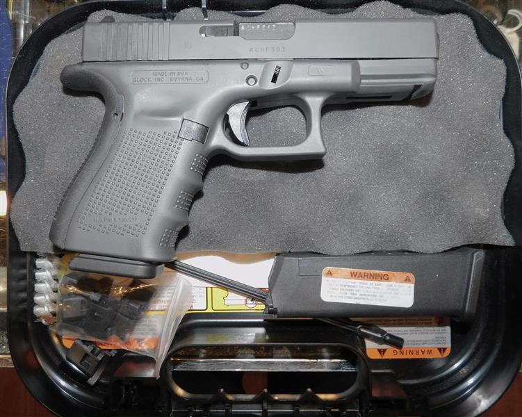 GLOCK G19 (NOT FOR SALE IN MASS.) IN 9MM CAL., WITH 3 .75" BARREL. COLOR GRAY. CONDITION 98%. SERIAL NUMBER ACHF393. GLOCK MODEL G19 IN .9MM CALIBER CALIBER, MIRROR BORE, GRIPS EXCELLENT, COMES WITH TWO FACTORY MAGAZINES, HARD CASE WITH PAPERS, 98% OVERALL CONDITION, OUR STOCK # D7635. OUR OLD STOCK # YA15982