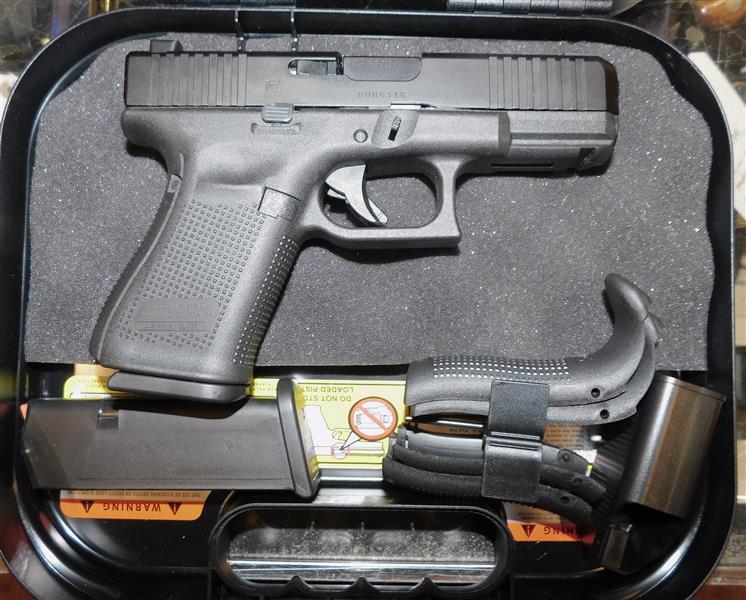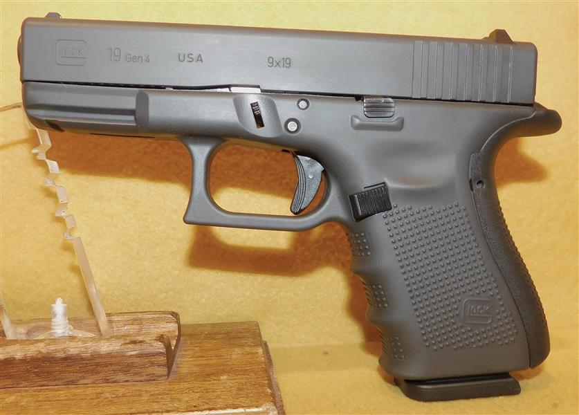 GLOCK G19 (NOT FOR SALE IN MASS.) IN 9MM CAL., WITH 3 .75" BARREL. COLOR BLACK. CONDITION 98%. SERIAL NUMBER BUHGG318. GLOCK MODEL G19 IN .9MM CALIBER, MIRROR BORE, GRIPS WITH EXTRA BACK STRAPS EXCELLENT, COMES WITH HARD CASE, PAPERS, TWO FACTORY MAGAZINES, 98% OVERALL CONDITION, OUR STOCK # D7747. OUR OLD STOCK # YA15983
