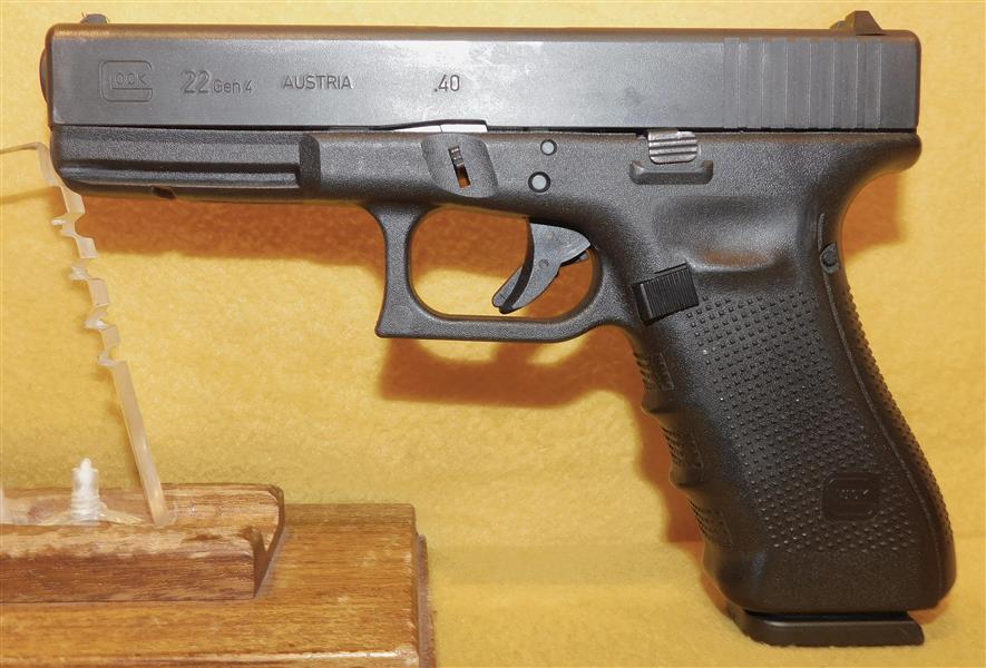 GLOCK G22 ( NOT FOR SALE IN MASS.) IN .40 CAL., WITH 4 .25" BARREL. COLOR BLACK. CONDITION 95%. SERIAL NUMBER PZK812. GLOCK MODEL G22 IN .40 CALIBER, MIRROR BORE, GRIPS EXCELLENT, COMES WITH TWO FACTORY MAGAZINES, HARD CASE WITH PAPERS, 95% OVERALL CONDITION, OUR STOCK # D7730. OUR OLD STOCK # YA15984