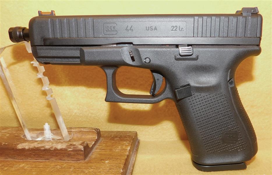 GLOCK G44 (NOT FOR SALE IN MASS.) IN .22 L.R. CAL., WITH 4 .5" BARREL. COLOR BLACK. CONDITION 98%. SERIAL NUMBER AHLN272. GLOCK MODEL G44 IN .22 L.R. CAL., MIRROR BORE, GRIPS WITH EXTRA BACK STRAPS EXCELLENT, COMES WITH HARD CASE, PAPERS, TWO FACTORY MAGAZINES, THREADED BARREL, 98% OVERALL CONDITION, OUR STOCK # D7736. OUR OLD STOCK # YA15985