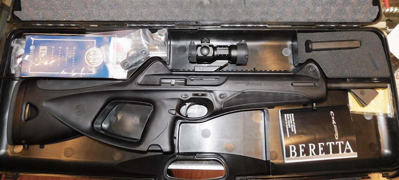 BERETTA CX4 STORM IN 9MM CAL., WITH 16 .5" BARREL. COLOR BLACK. CONDITION 98% LIKE NEW. SERIAL NUMBER CX49361. BERETTA MODEL CX4 STORM IN .9MM CALIBER, TAKES BERETTA 92 MAGAZINES, MIRROR BORE, STOCK AND FORE ARM EXCELLENT, COMES WITH ADCO RED DOT WITH MOUNT, TWO FACTORY MAGAZINES, HARD CASE WITH PAPERS, APPEARS TO BE UNFIRED, 98% LIKE NEW OVERALL CONDITION, OUR STOCK # D8091. OUR OLD STOCK # YA16104