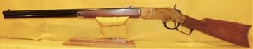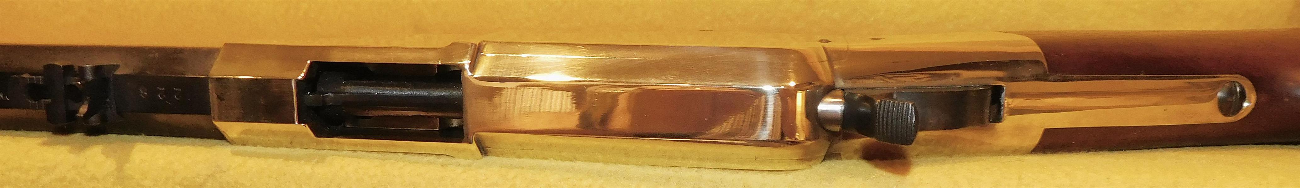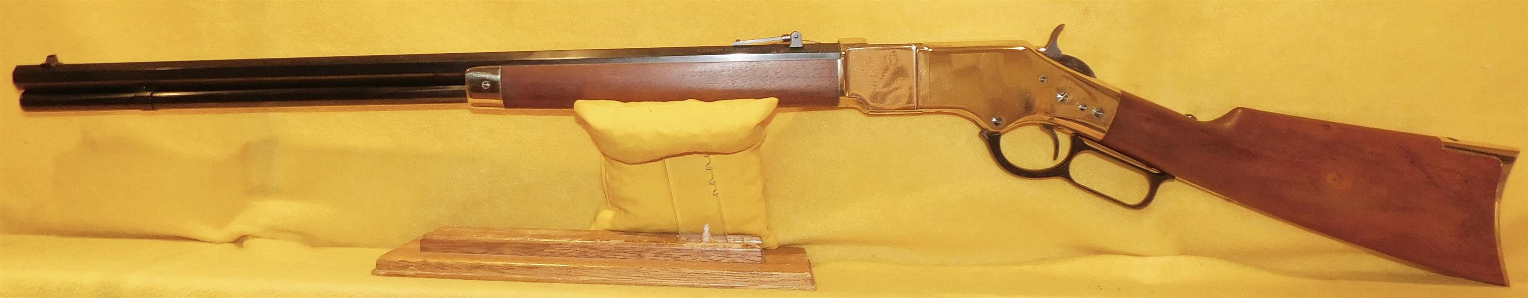 UBERTI 1874 IN .44-40 CAL., WITH 24" BARREL. COLOR BRASS. CONDITION 98%. SERIAL NUMBER 40842. UBERTI MODEL 1874 BRASS FRAME (CIRCA 1978) IN .44-40 CALIBER, MIRROR BORE, LADDER REAR SIGHT, SMOOTH WALNUT STOCK AND FORE END EXCELLENT, 97% OVER ALL CONDITION, OUR STOCK # D8455. OUR OLD STOCK # YA16214