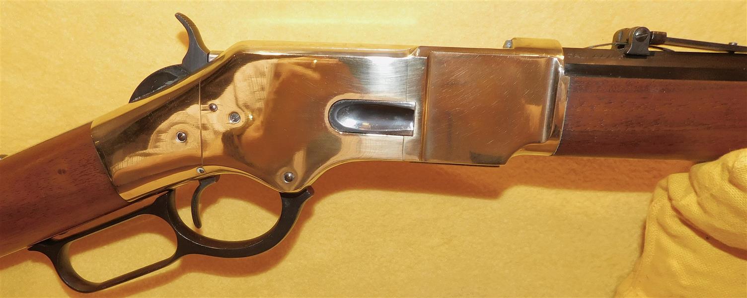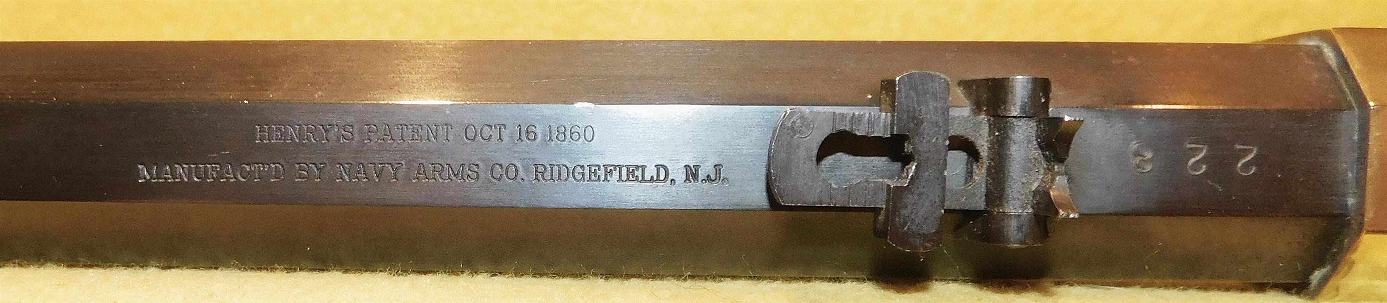 NAVY ARMS HENRY IN .44-40 CAL., WITH 22" BARREL. COLOR BRASS/BLUE. CONDITION 98%. SERIAL NUMBER 228. NAVY ARMS MODEL 1860 HENRY LEVER ACTION CARBINE IN .44 WCF (.44-40) CALIBER, THIS 1860 HENRY CARBINE WAS MADE IN THE UNITED STATES BY VAL FROGET JR. OF NAVY ARMS (CIRCA 1973), THIS IS YEARS BEFORE UBERTI IN ITALY STARTED MAKING THE 1860 HENERY (1979-1980), THE MIRROR BORE OCTAGON BARREL PARED WITH A GERMAN SILVER FRONT BLADE AND A LADER STYLE REAR SIGHT IS INTEGRAL TO THE REAR PORTION OF THE FULL LENGTH MAGAZINE TUBE THE FLAT TOP OF THE OCTAGON BARREL IS ROLL STAMPED ( HENRY,S PATENT OCT 16 1860 AND MANUFACTURED BY NAVY ARMS CO. RIDGEFIELD N.J.), THE LEFT-SIDE BARREL FLAT IS STAMPED (.44-40), THE BARREL, MAGAZINE TUBE, HAMMER AND LOADING LEVER HAVE BEEN BLUED, WITH THE RECEIVER, SHELL- LIFTER AND CRESENT BUTT-PLATE MADE OF SOLID BRASS, THE HAND OIL RUBBED BLACK WANUT STOCK IS 100%, 500 TO 1000 WERE EVER BUILT THIS INCLUDES CARBINES 22” AND RIFLES 24” WITH THIS CARBINES SERIAL NUMBER BEING (228), OVERALL CONDITION IS 98% OUR STOCK # D8450. OUR OLD STOCK # YA16203