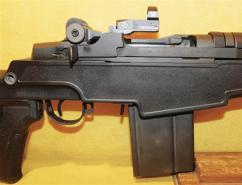 SPRINGFIELD ARMORY SOCOM 16 IN .308 CAL., WITH 16 .5" BARREL. COLOR BLACK. CONDITION 97%. SERIAL NUMBER 395750. SPRINGFIELD ARMORY MODEL SOCOM 16 IN .308 CALIBER, MIRROR BORE, ALL WEATHER COLLAPSIBLE STOCK EXCELLENT, COMES WITH A VORTEX VENOM RED DOT, ONE TWENTY ROUND AND ONE FIVE ROUND FACTORY MAGAZINE, 97% OVERALL CONDITION, OUR STOCK # D8509. OUR OLD STOCK # YA16216