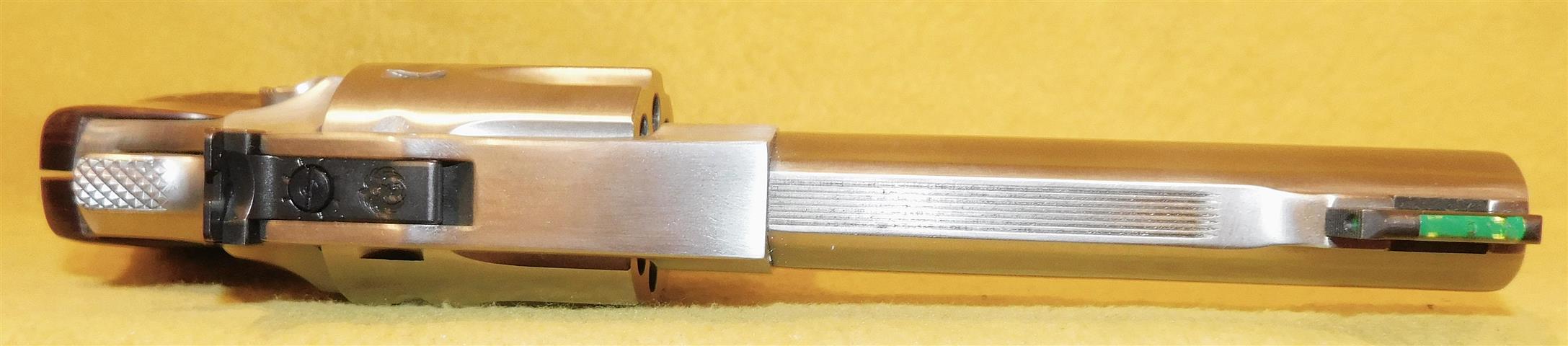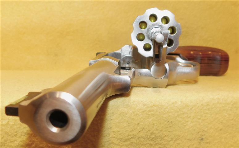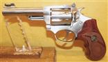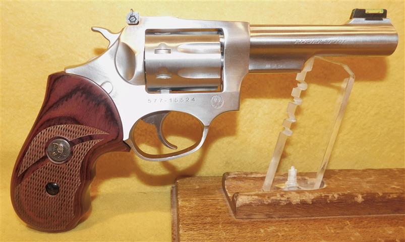 RUGER SP101 IN .22 L.R. CAL., WITH 4" BARREL. COLOR STAINLESS STEEL. CONDITION 98%+ LIKE NEW UNFIRED. SERIAL NUMBER 577-15524. RUGER MODEL SP101 (EIGHT SHOT) IN .22 L.R. CALIBER, MIRROR BORE, PACKMYER ROSE WOOD GRIP EXCELLENT, FIBER OPTIC FRONT SIGHT, 98%+ LIKE NEW UNFIRED CONDITION, OUR STOCK # D8269. OUR OLD STOCK # YA16172