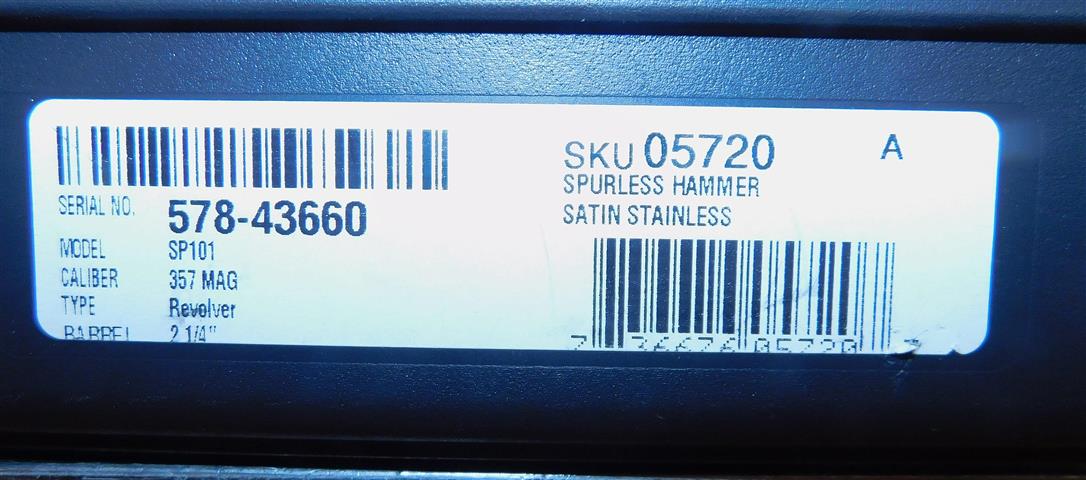 RUGER SP101 IN .357 MAGNUM CAL., WITH 2 .25" BARREL. COLOR STAINLESS STEEL. CONDITION NEW IN BOX. SERIAL NUMBER 578-43660. RUGER MODEL SP101 IN .357 MAGNUM CALIBER, NEW IN BOX OVERALL CONDITION, OUR STOCK # D3699. OUR OLD STOCK # YA16253