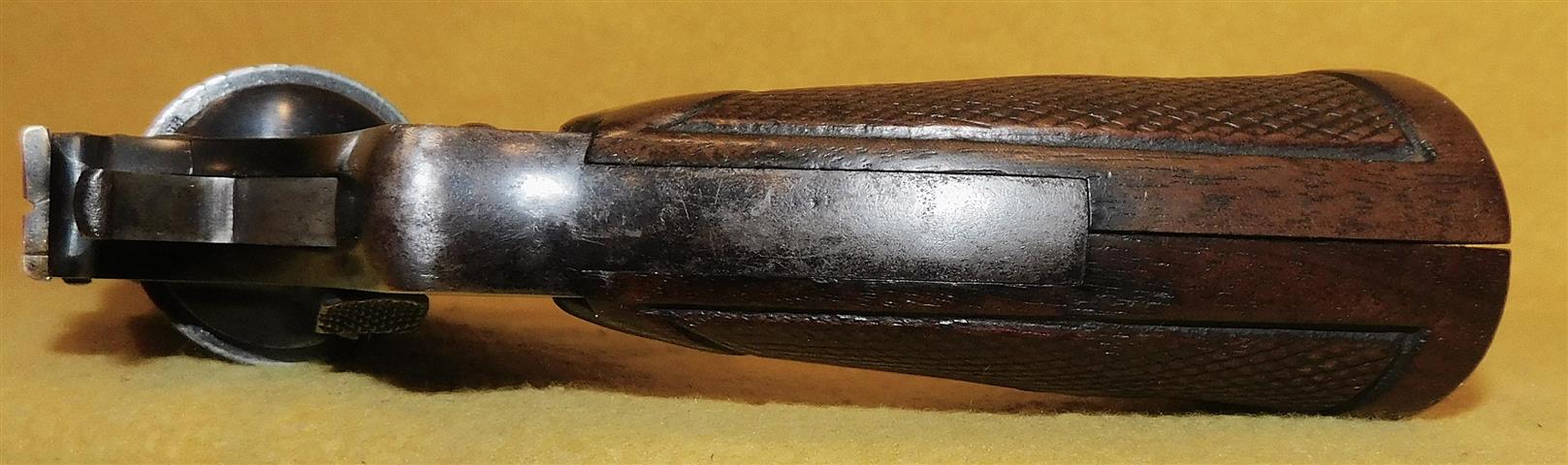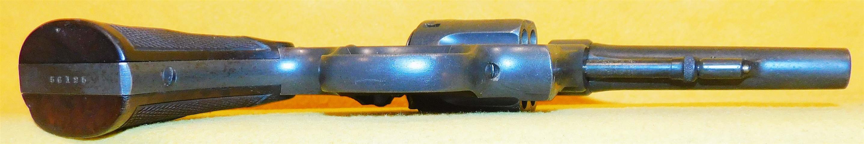 S&W 1905 IN 32-20 CAL., WITH 4" BARREL. COLOR BLUE. CONDITION 65%. SERIAL NUMBER 56125. S&W MODEL 1905 IN .32/20 CALIBER, BRIGHT BORE, CHECKERED WALNUT GRIPS WITH SILVER MEDALLIONS VERY GOOD, FIXED FRONT BLADE, 65% OVERALL CONDITION, OUR STOCK # D4370. OUR OLD STOCK # YA15332