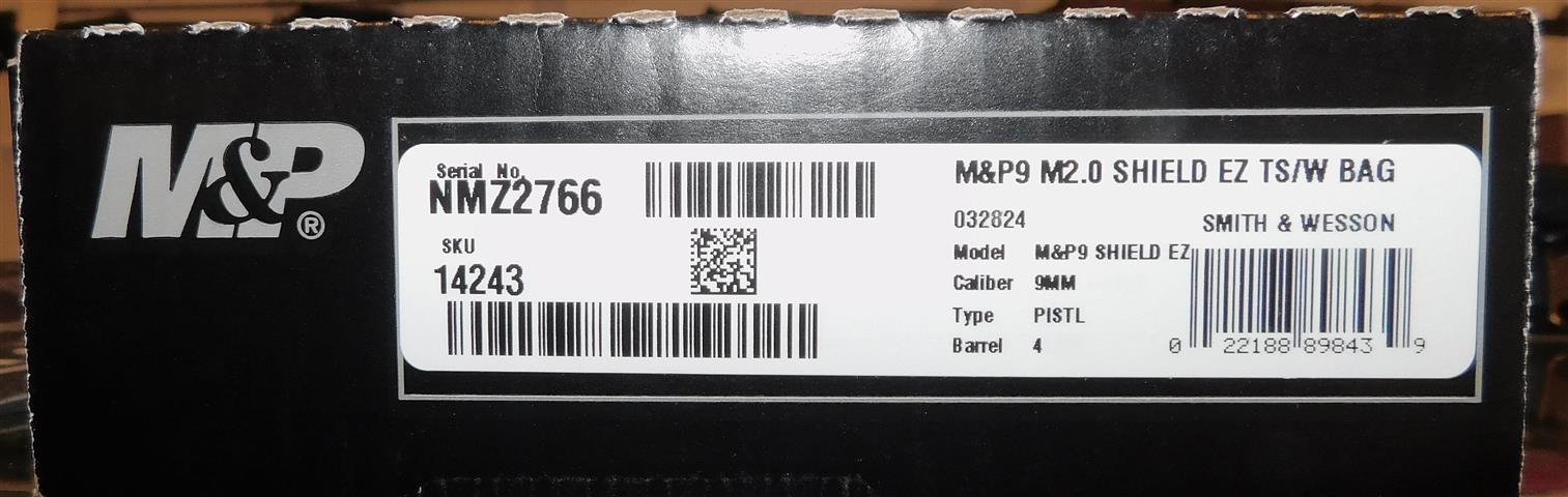 S&W M&P 9 SHIELD EZ IN 9MM CAL., WITH 4" BARREL. COLOR BLACK. CONDITION NEW IN BOX. SERIAL NUMBER NMZ2766. S&W MODEL M&P 9 SHIELD EZ IN 9MM CALIBER, COMES WITH FOUR FACTORY MAGAZINES, POUCH WITH BOX AND PAPERS, NEW IN BOX OVERALL CONDITION, OUR STOCK # D6511. OUR OLD STOCK # YA15462