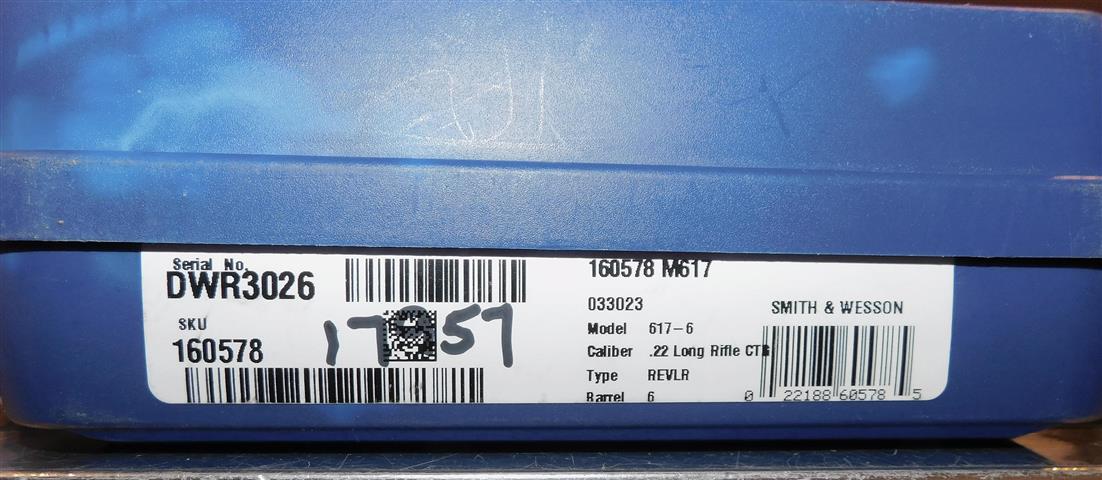 S&W 617-6 IN .22 L.R. CAL., WITH 6" BARREL. COLOR STAINLESS STEEL. CONDITION 98%. SERIAL NUMBER DWR3026. S&W MODEL 617-6 IN .22 L.R. CALIBER, MIRROR BORE, FINGER GROOVE RUBBER GRIPS EXCELLENT, ADJUSTABLE REAR SIGHT, COMES WITH HARD CASE WITH PAPERS, 98% OVERALL CONDITION, OUR STOCK # D6638. OUR OLD STOCK # YA15498