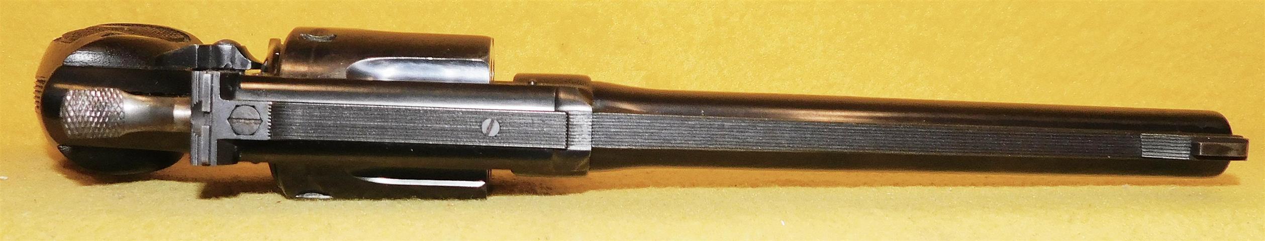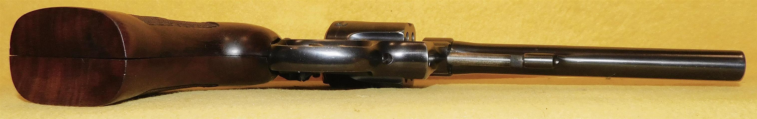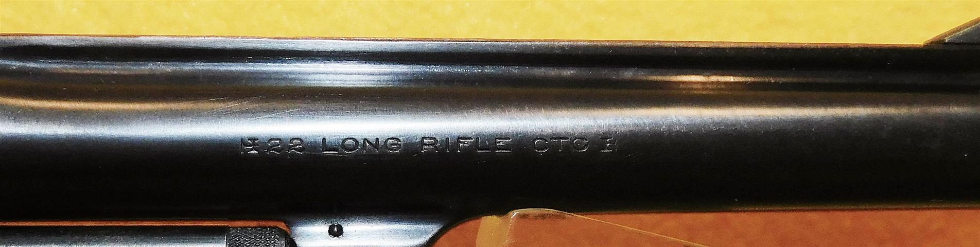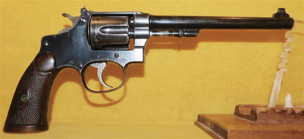 S&W HAND EJECTOR IN .22 L.R. CAL., WITH 6" BARREL. COLOR BLUE. CONDITION 85%+. SERIAL NUMBER 364853. S&W MODEL HAND EJECTOR (CIRCA 1922) IN .22 L.R. CALIBER, BRIGHT BORE, WALNUT CHECKERED GRIPS WITH OUT MEDALLIONS VERY GOOD, ADJUSTABLE REAR SIGHT WITH (U) BLADE, 85% OVERALL CONDITION, OUR STOCK # D7179. OUR OLD STOCK # YA15746