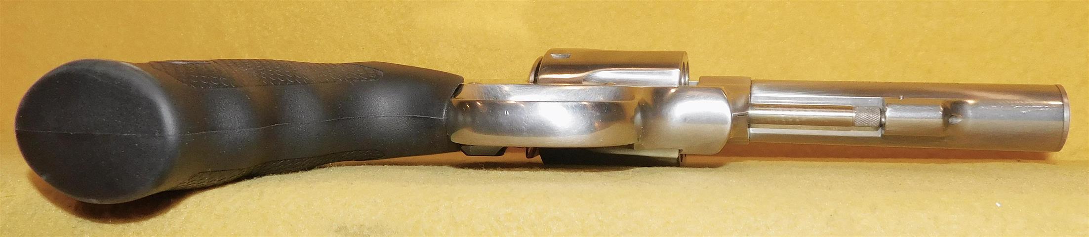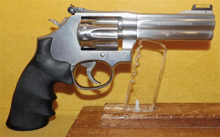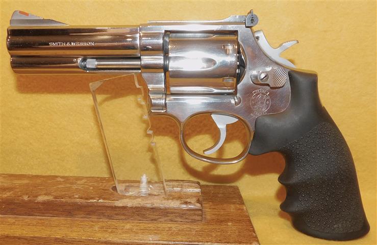 S&W 686 (NO DASH )BRIGHT POLISH IN .357 MAGNUM CAL., WITH 4" BARREL. COLOR STAINLESS STEEL. CONDITION 98% LIKE NEW. SERIAL NUMBER AHS6431. S&W MODEL 686 (NO DASH) BRIGHT POLISH IN .357 MAGNUM CALIBER, BRIGHT SHINY BORE, FACTORY FINGER GROOVE RUBBER GRIPS EXCELLENT, 98% LIKE NEW OVERALL CONDITION, OUR STOCK # D8083. OUR OLD STOCK # YA16101