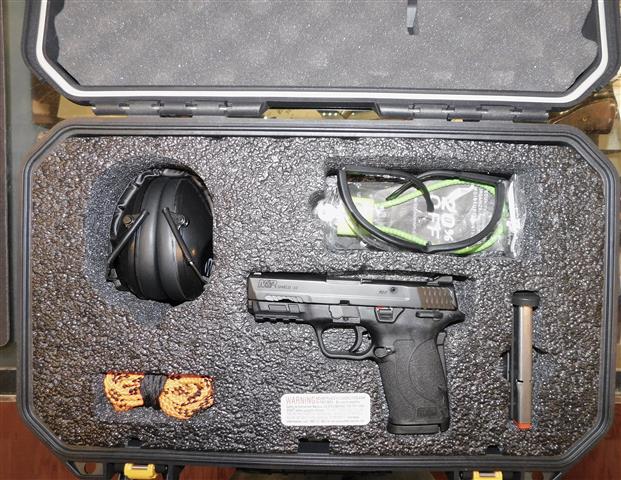 S&W M&P 9 SHIELD EZ (RANGE PACKAGE) IN 9MM CAL., WITH 3 .5" BARREL. COLOR BLACK. CONDITION 98%+ UNFIRED LIKE NEW. SERIAL NUMBER RFU2815. S&W MODEL M&P 9 SHIELD EZ 2.0 (RANGE PACKAGE) IN 9MM CALIBER, COMES WITH TWO FACTORY MAGAZINES, EYE WARE, HEAD PHONES, CLEANING CORD, PLANO HATER TIGHT CASE, 98% UNFIRED LIKE NEW OVERALL CONDITION, OUR STOCK # D5115. OUR OLD STOCK # YA15874