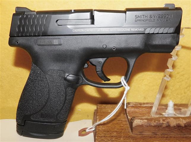 S&W M&P 9 SHIELD IN 9MM CAL., WITH 3 .125" BARREL. COLOR BLACK. CONDITION 98%. SERIAL NUMBER HWE6013. S&W MODEL M&P 9 SHIELD IN 9MM CALIBER, MIRROR BORE, GRIPS EXCELLENT, COMES WITH ONE FACTORY MAGAZINE, 98% OVERALL CONDITION, OUR STOCK # D7285. OUR OLD STOCK # YA15883