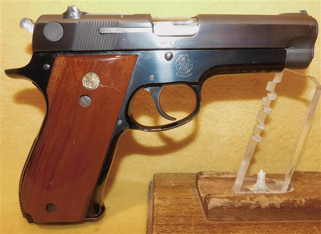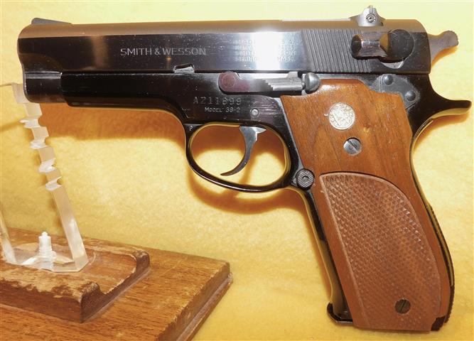 S&W 39-2 IN 9MM CAL., WITH 4" BARREL. COLOR BLUE. CONDITION 98%. SERIAL NUMBER A428216. S&W MODEL 39-2 IN 9MM CALIBER, MIRROR BORE, SMOOTH WALNUT GRIPS EXCELLENT, COMES WITH ONE FACTORY MAGAZINE, 98% OVERALL CONDITION, OUR STOCK # D8206. OUR OLD STOCK # YA16155