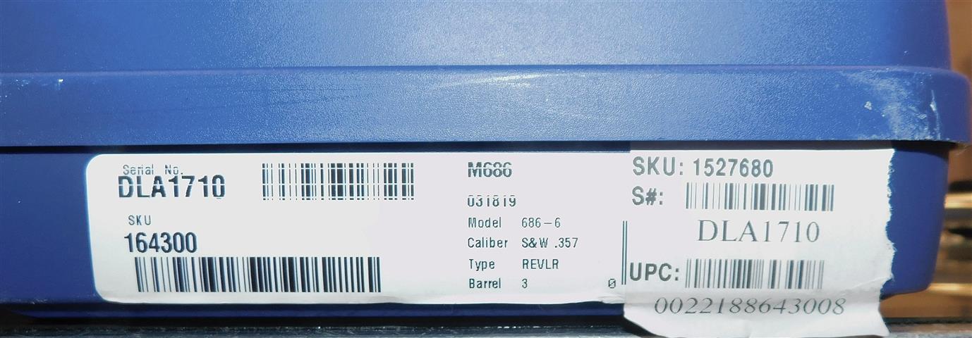 S&W 686-6 (SEVEN SHOT) IN .357 MAGNUM CAL., WITH 3" BARREL. COLOR STAINLESS STEEL. CONDITION 98% LIKE NEW. SERIAL NUMBER DLA1710. S&W MODEL 686-6 PLUS (SEVEN SHOT) IN .357 MAGNUM CALIBER, MIRROR BORE, FINGER GROOVE RUBBER GRIPS EXCELLENT, COMES WITH HARD CASE AND PAPERS, 98% LIKE NEW OVERALL CONDITION, OUR STOCK # D8217. OUR OLD STOCK # YA16164