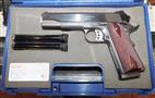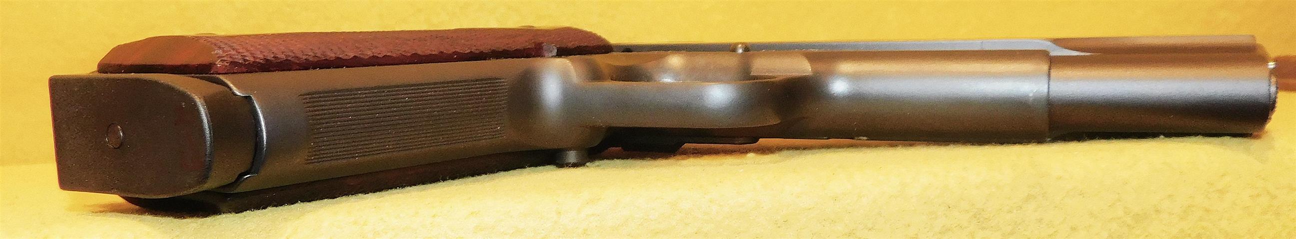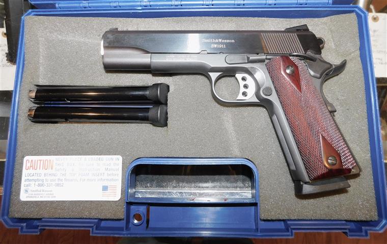 S&W SW1911 IN .45 ACP CAL., WITH 5" BARREL. COLOR BLUE. CONDITION 98% (UNFIRED). SERIAL NUMBER JRF2906. S&W MODEL (EARLY 1911) SW1911 (APPEARS UNFIRED) IN .45 ACP CALIBER, MIRROR BORE, WALNUT CHECKERED DIAMOND GRIPS EXCELLENT, COMES WITH THREE FACTORY MAGAZINES, HARD CASE WITH PAPERS, BEAUTIFUL DEEP BLUE FINISH ON THE SLIDE, 98% (UNFIRED?) OVERALL CONDITION, OUR STOCK # D8245. OUR OLD STOCK # YA16165