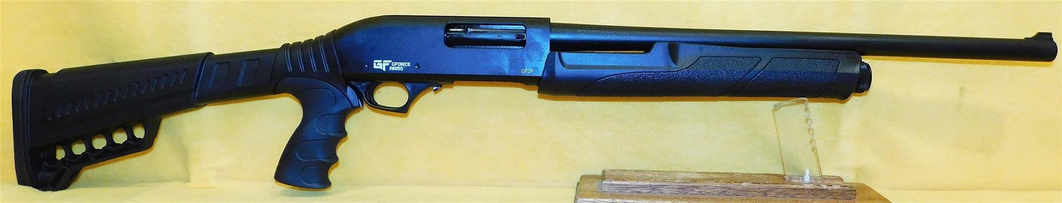 G FORCE ARMS GF2P IN 12 GA CAL., WITH 20" BARREL. COLOR BLACK. CONDITION NEW IN BOX. SERIAL NUMBER 20-60228. G FORCE ARMS MODEL GF2P PUMP 12 GAUGE SHOT GUN, FIXED CYLINDER BORE, BLADE FRONT SIGHT, FIXED REAR STOCK WITH PISTOL GRIP, THREE INCH CHAMBER, NEW IN BOX OVERALL CONDITION, OUR STOCK # D2227. OUR OLD STOCK # YA13551