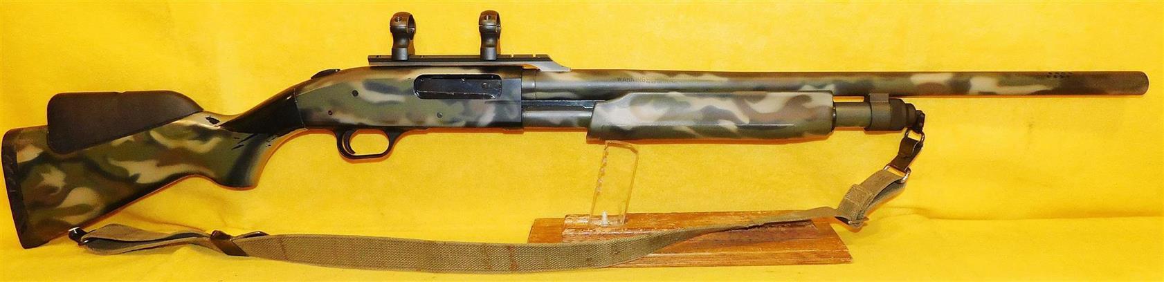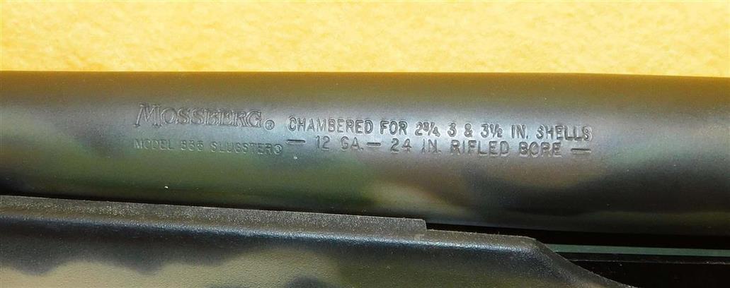 MOSSBERG 835 IN 12 GA. CAL., WITH ]24" BARREL. COLOR CAMO. CONDITION 93%+. SERIAL NUMBER UM714162. MOSSBERG MODEL 835 IN 12 GAUGE CALIBER, CANTILEVER PORTED RIFLED BARREL NAS A MIRROR BORE, ALL WEATHER CAMO STOCK AND FORE ARM IS VERY GOOD TO EXCELLENT, 2 ¾” 3” AND 3 ½” CHAMBER, 93%+ OVERALL CONDITION, OUR STOCK # D4810. OUR OLD STOCK # YA14870