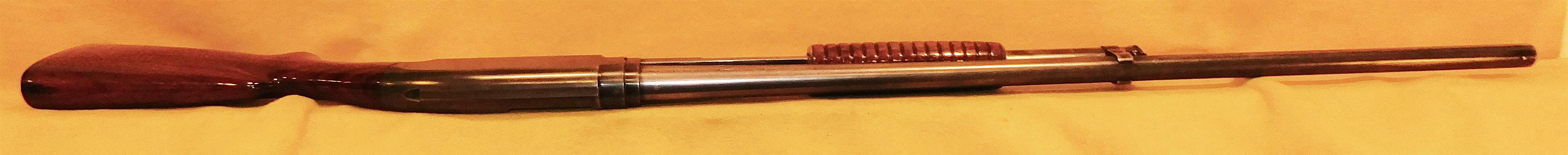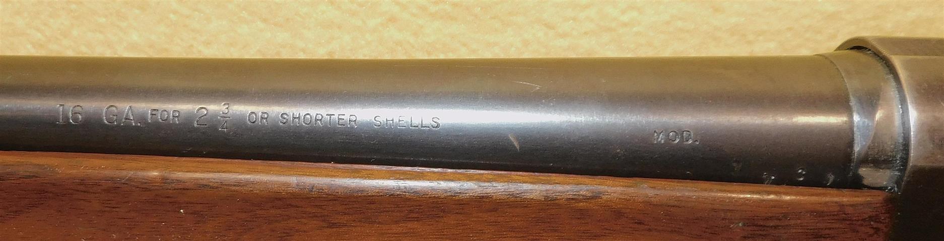 WINCHESTER 12 IN 16 GA., WITH 28" BARREL. COLOR BLUE. CONDITION 80%?. SERIAL NUMBER 478145. WINCHESTER MODEL 12 (CIRCA 1927) IN 16 GUAGE CALIBER, BRIGHT SHINY ROUND SINGLE BEAD BARREL WITH FIXED FULL CHOKE, STOCK HAS BEEN CUT TO 12 .5” L.O.P. BUT VERY NICELY DONE. THIS WOULD MAKE A FINE .16 GUAGE FOR A YOUTH OR FEMALE HUNTER, 80%? OVERALL CONDITION, OUR STOCK # D5982. OUR OLD STOCK # YA15475