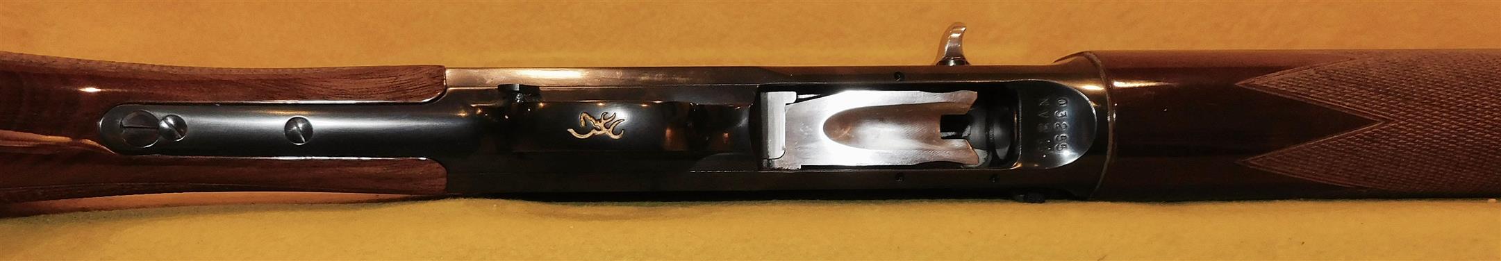 BROWNING A-5 (SLUG) LIGHT WEIGHT IN 12 GA. CAL., WITH 24" BARREL. COLOR BLUE. CONDITION 98%+ UNFIRED. SERIAL NUMBER 03255NV211. BROWNING MODEL A-5 LIGHT WEIGHT SLUG GUN (JAPAN) (CIRCA 1992) IN 12 GUAGE CALIBER, 2 ¾” INCH CHAMBER, MIRROR SMOOTH BORE BARREL WITH REAR ADJUSTABLE SIGHT AND BLADE FRONT, WALNUT ROUND KNOB CHECKERED STOCK WITH FORE END EXCELLENT, COMES WITH TATTERED ORIGINAL BOX, 98%+ UNFIRED OVERALL CONDITION, OUR STOCK # D6685. OUR OLD STOCK # YA15507