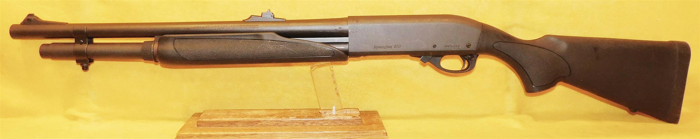 REMINGTON 870 (TACTICAL) IN 12 GA CAL., WITH 20" BARREL. COLOR MATTE. CONDITION 95%. SERIAL NUMBER AB670610M. REMINGTON 870 (TACTICAL), MIRROR BORE, EXTENDED TUBE, RIFLE SIGHTS, ALL WEATHER STOCK AN FORE ARM VERY GOOD TO EXCELLENT, 95% OVERALL CONDITION, OUR STOCK # D7926. OUR OLD STOCK # YA16040