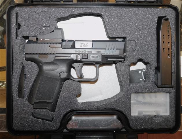CANIK TP9 IN 9MM CAL., WITH 3 .25" BARREL. COLOR BLACK. CONDITION 98%. SERIAL NUMBER 24CB10261. CANIK MODEL TP9 IN 9MM CALIBER, MIRROR BORE, GRIP EXCELLENT, COMES WITH TWO FACTORY MAGAZINES, RED DOT, HARD CASE WITH PAPERS, 98% OVERALL CONDITION, OUR STOCK # D8183. OUR OLD STOCK # YA16170