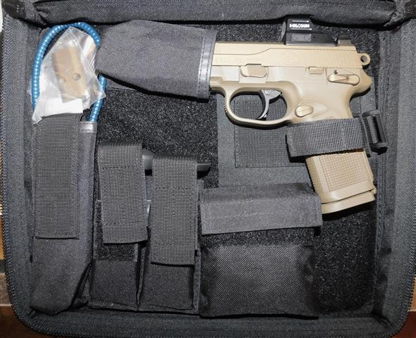 WALTHER PDP IN 9MM CAL., WITH 5" BARREL. COLOR FDE. CONDITION 98%+. SERIAL NUMBER FDO8636. WALTHER MODEL PDP IN 9MM CALIBER, MIRROR BORE, SPECIAL BURNT BRONZE FRAME EXCELLENT, COMES WITH RED DOT MOUNTING PLATE, ONE FACTORY MAGAZINE, HARD CASE WITH PAPERS, NOT FOR SALE IN MASS., 98%+ OVERALL CONDITION, OUR STOCK # D4114. OUR OLD STOCK # YA14460