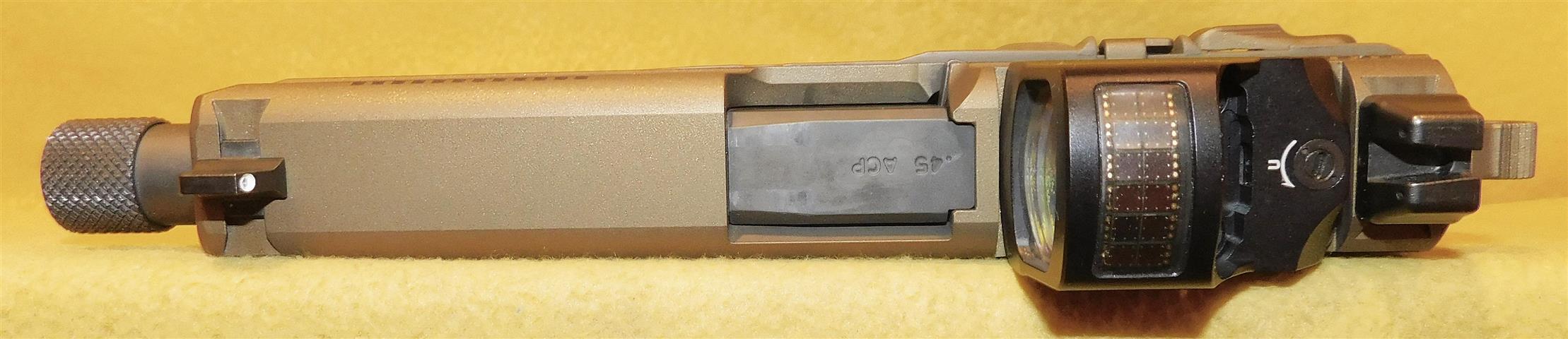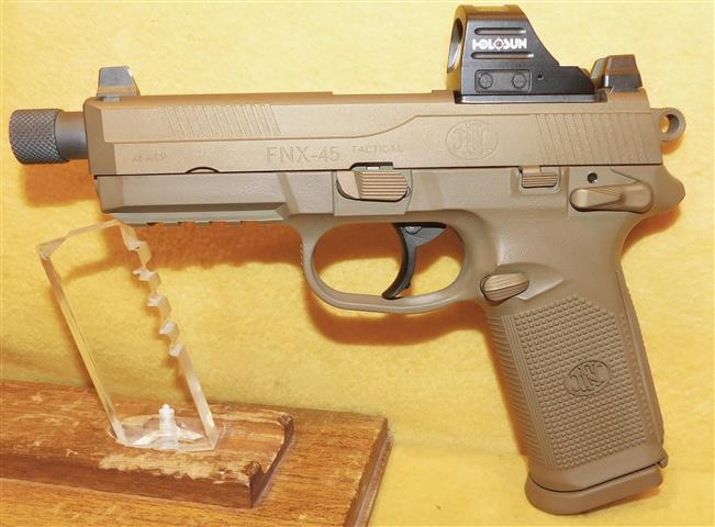 FNH FNH-45 TACTCAL IN .45 ACP CAL., WITH 5 .25" BARREL. COLOR FDE. CONDITION 96%+. SERIAL NUMBER FX3U060013. FNH MODEL FNH-45 TACTICAL IN .45 ACP CALIBER, MIRROR BORE, GRIPS EXCELLENT, THREADED BARREL, SOFT CASE, THREE MAGAZINES, 96%+ OVERALL CONDITION, OUR STOCK # D8277. OUR OLD STOCK # YA16174