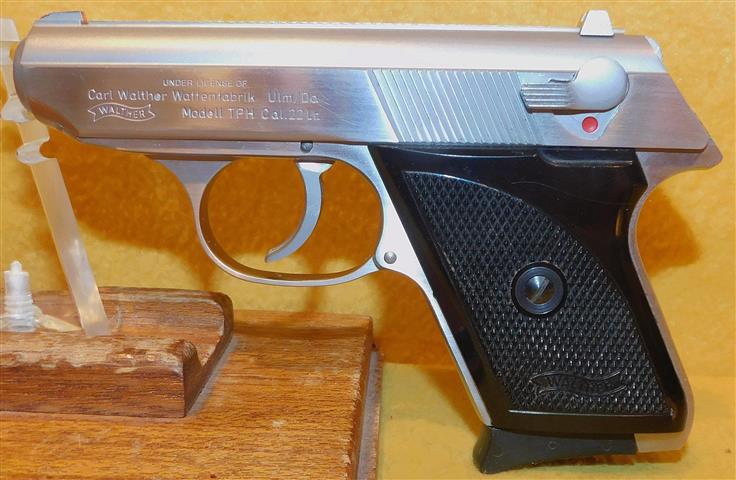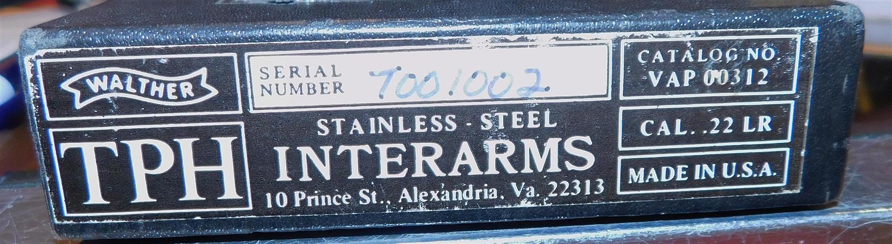 WALTHER TPH IN .22 CAL., WITH 2 .5" BARREL. COLOR STAINLESS STEEL. CONDITION 98%+. SERIAL NUMBER T001002. WALTHER MODEL TPH IN .22 L.R. CALIBER, MIRROR BORE, GRIPS EXCELLENT, COMES WITH BOX, PAPERS, AND GRAY POUCH, ONE FACTORY MAGAZINE, 98%+ OVERALL CONDITION, OUR STOCK # D8109. OUR OLD STOCK # YA16246