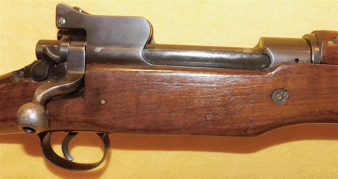 U.S. REMINGTON 1917 IN .30-06 CAL., WITH 26" BARREL. COLOR BLUE. CONDITION 90%?. SERIAL NUMBER 569259. U.S. REMINGTON MODEL OF 1917 IN .30-06 CALIBER, SHINNY BORE WITH A LOT OF PITTING, STOCK HAS BEEN REFINISHED BUT THE EAGLE CARTOUCHE IS STILL VISIBLE UNDERNEATH, FLAMING BOMB WITH A 9-18 BARREL DATE, REMINGTON BOLT, 90%? OVERALL CONDITION, OUR STOCK # D8251. OUR OLD STOCK # YA16167