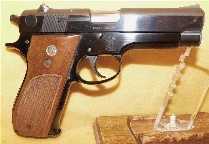 S&W 39-2 IN 9MM CAL., WITH 4" BARREL. COLOR BLUE. CONDITION 98%. SERIAL NUMBER A311827. S&W MODEL 39-2 IN 9MM CALIBER, MIRROR BORE, CHECKERED WALNUT GRIP PANNELS EXCELLENT, COMES WITH ONE FACTORY MAGAZINE, 98% OVERALL CONDITION, OUR STOCK # D 8356 . OUR OLD STOCK # YA16192
