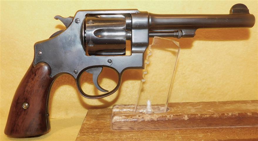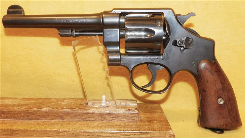 S&W DA45 IN .45 ACP CAL., WITH 5 .5" BARREL. COLOR BLUE. CONDITION 95%+. SERIAL NUMBER 107306. S&W MODEL DA45 IN .45 ACP CALIBER, (CIRCA 1917-1918) MIRROR BORE, GRIPS AT SOME POINT HAVE BEEN REPLACED WITH PROPER PERIOD MIL SERP SMOOTH WALNUT GRIPS IN VERY GOOD TO EXCELLENT CONDITION, ALL ORIGINAL FINISH, EAGLE HEAD WITH FLAMING BOMB PROOF, 95%+ OVERALL CONDITION, OUR STOCK # D8529. OUR OLD STOCK # YA16233
