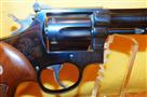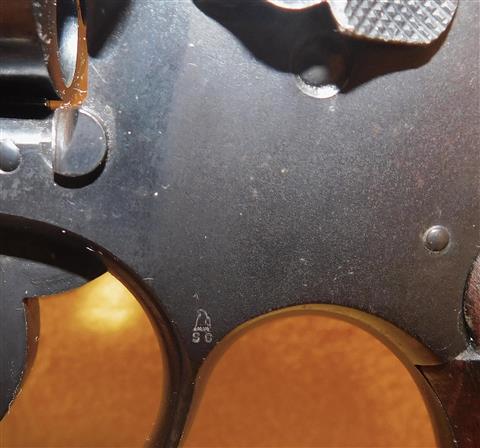 S&W 38 IN .38 SPECIAL CAL., WITH 2" BARREL. COLOR BLUE. CONDITION 95%. SERIAL NUMBER 515000. S&W MODEL 38 IN .38 SPECIAL CALIBER (SHROUDED HAMMER), MIRROR BORE, PACKMYER GRIPS EXCELLENT, SPECKLING ON RIGHT SIDE OF RECEIVER, 95% OVERALL CONDITION, OUR STOCK # D7483. OUR OLD STOCK # YA15816