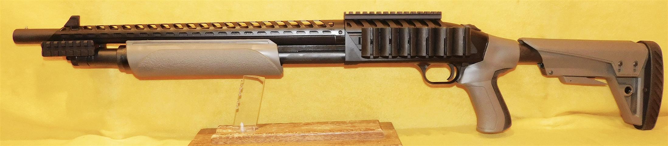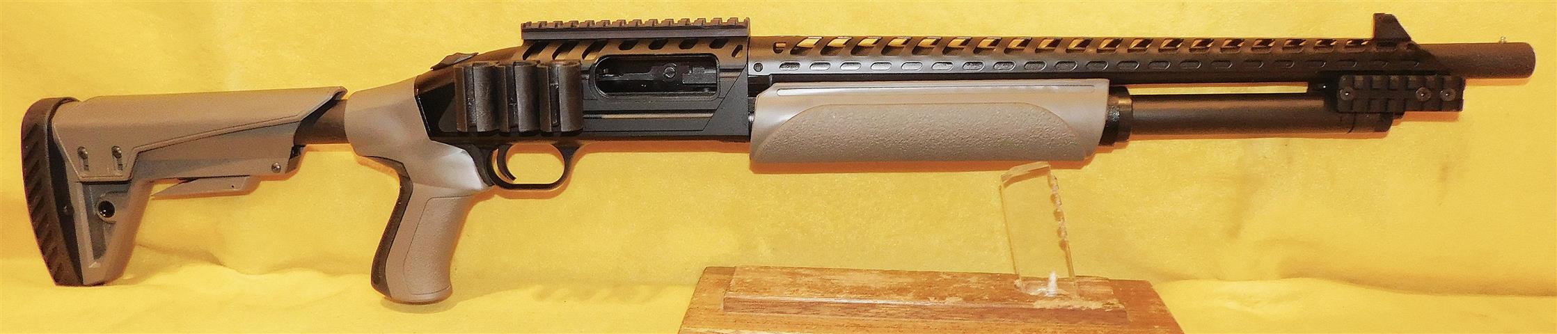 MOSSBERG 88 TACTICAL (IN STORE PICKUP) IN 12 GA CAL., WITH 18" BARREL. COLOR BLACK. CONDITION 98%+ UNFIRED. SERIAL NUMBER MV0672573. MOSSBERG MODEL 88 TACTICAL (PUMP) (UNFIRED) IN .12 GUAGE CALIBER, COMES WITH PISTOL GRIP STOCK (WITH THE ORIGINAL), HEAT SHIELD, SIDE SADDLE SHELL HOLDER WITH PICATINNY RAIL, FORE ARM WITH DOUBLE PICATINNY RAILS, DOUBLE RIFLE CASE, SIX BOXES .12 GUAGE SHELLS (THREE SLUGS, THREE BUCK SHOT), DUE TO THE AMMO IN STORE TRANSFER ONLY, 98%+ UNFIRED OVERALL CONDITION, OUR STOCK # D8043. OUR OLD STOCK # YA16080