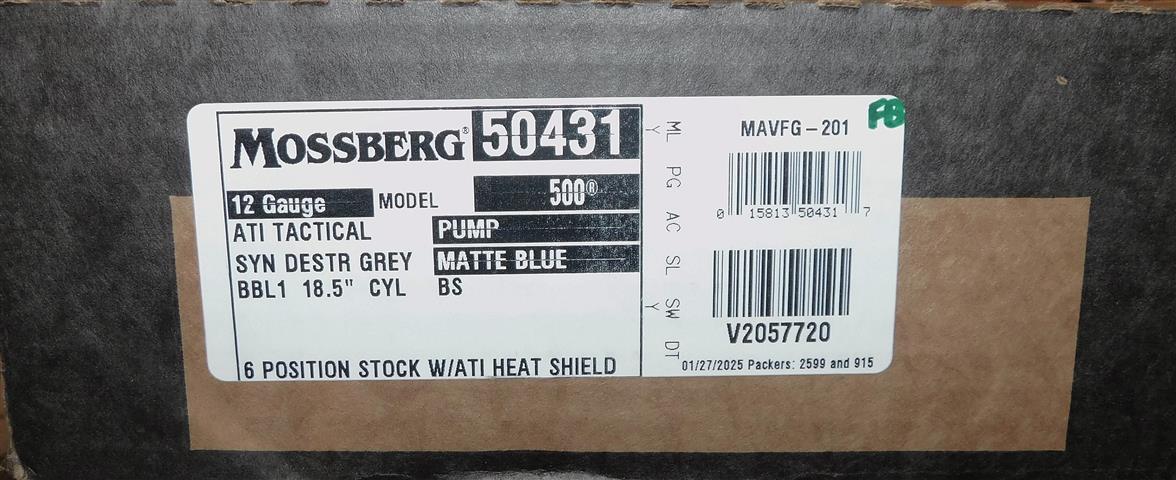 MOSSBERG 500 ATI TACTICAL IN 12 GA CAL., WITH 18.5" BARREL. COLOR BLACK. CONDITION 98%+ UNFIRED. SERIAL NUMBER V2057770. MOSSBERG MODEL 500 ATI TACTICAL IN 12 GUAGE CALIBER WITH FIXED CYLINDER BORE, 2 ¾” AND 3” CHAMBER, DUAL SIDE AMMO SADDLES, ALL WEATHER COLLAPSIBLE STOCK AND FORE END, FRONT BLADE SIGHT, EXTENDED TUBE, PICATINNY RAIL, 98%+ UNFIRED OVERALL CONDITION, OUR STOCK # D8242. OUR OLD STOCK # YA16168