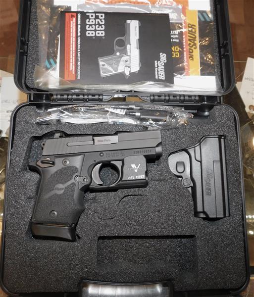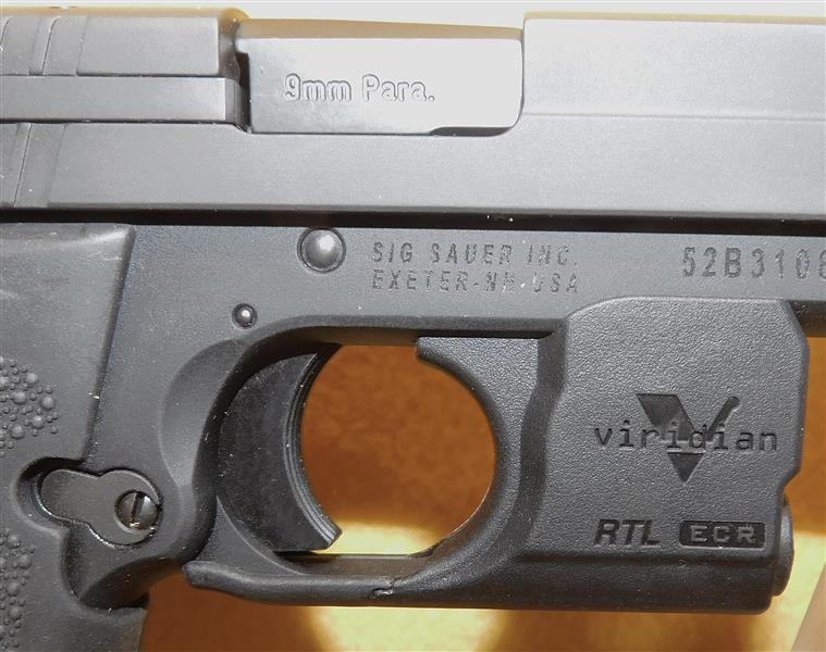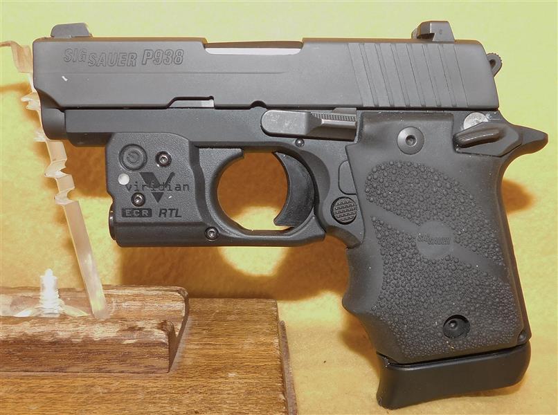 SIG SAUER 938 IN 9MM CAL., WITH 3" BARREL. COLOR MATTE. CONDITION 98%+ UNFIRED. SERIAL NUMBER 52B30808. SIG SAUER MODEL 938 IN 9MM CALIBER, COMES WITH A VIRIDIAN FLASHLIGHT WITH SPARE BATTERIES, FINGER GROOVE GRIPS EXCIPIENT, ONE FACTORY MAGAZINE, HOLSTER, HARDCASE WITH PAPERS, 98%+ UNFIRED OVERALL CONDITION, OUR STOCK # D8527. OUR OLD STOCK # YA16224