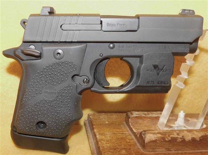 SIG SAUER P938 IN .9MM CAL., WITH 3" BARREL. COLOR MATTE. CONDITION 96%. SERIAL NUMBER 528190291. SIG SAUER MODEL P938 IN .9MM CALIBER, MIRROR BORE, RUBBER FINGER GROOVE GRIPS EXCELLENT, COMES WITH TWO FACTORY MAGAZINES, LASOR, 96% OVERALL CONDITION, OUR STOCK # D8082. OUR OLD STOCK # YA16098