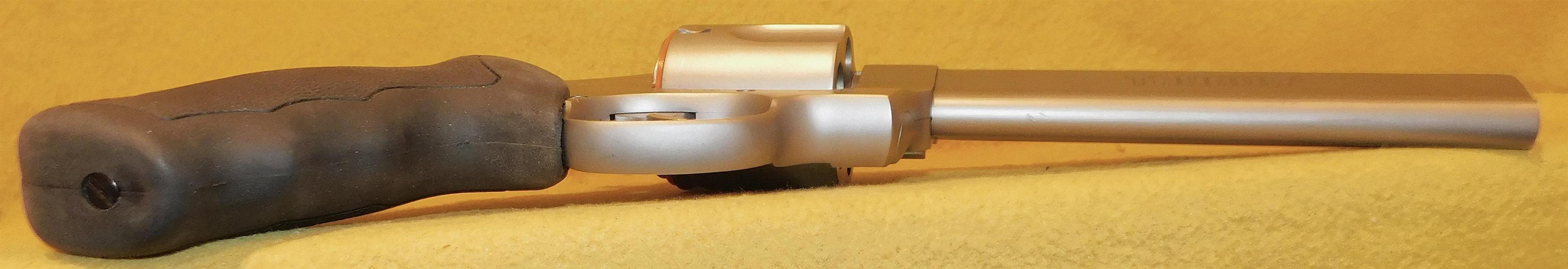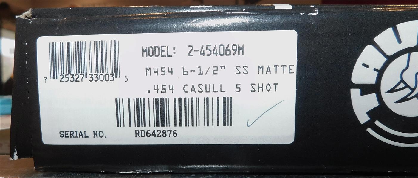 TAURUS RAGING BULL IN .458 CASULL CAL., WITH 6 .5" BARREL. COLOR SILVER. CONDITION 98%+. SERIAL NUMBER RD642876. TAURUS MODEL RAGING BULL IN .454 CASULL/.45 LONG COLT CALIBER, MIRROR BORE WITH PORTED BARREL, RUBBER FINGER GROOVE GRIPS EXCELLENT, NOT FOR SALE IN MASS., COMES WITH FACTORY BOX AND PAPERS, 98%+ OVERALL CONDITION, OUR STOCK # D8296. OUR OLD STOCK # YA16191
